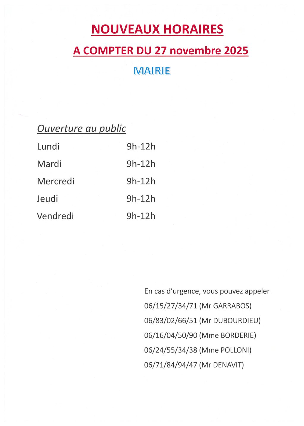 Nous vous informons que votre Mairie sera , de nouveau, ouverte tous les matins au public