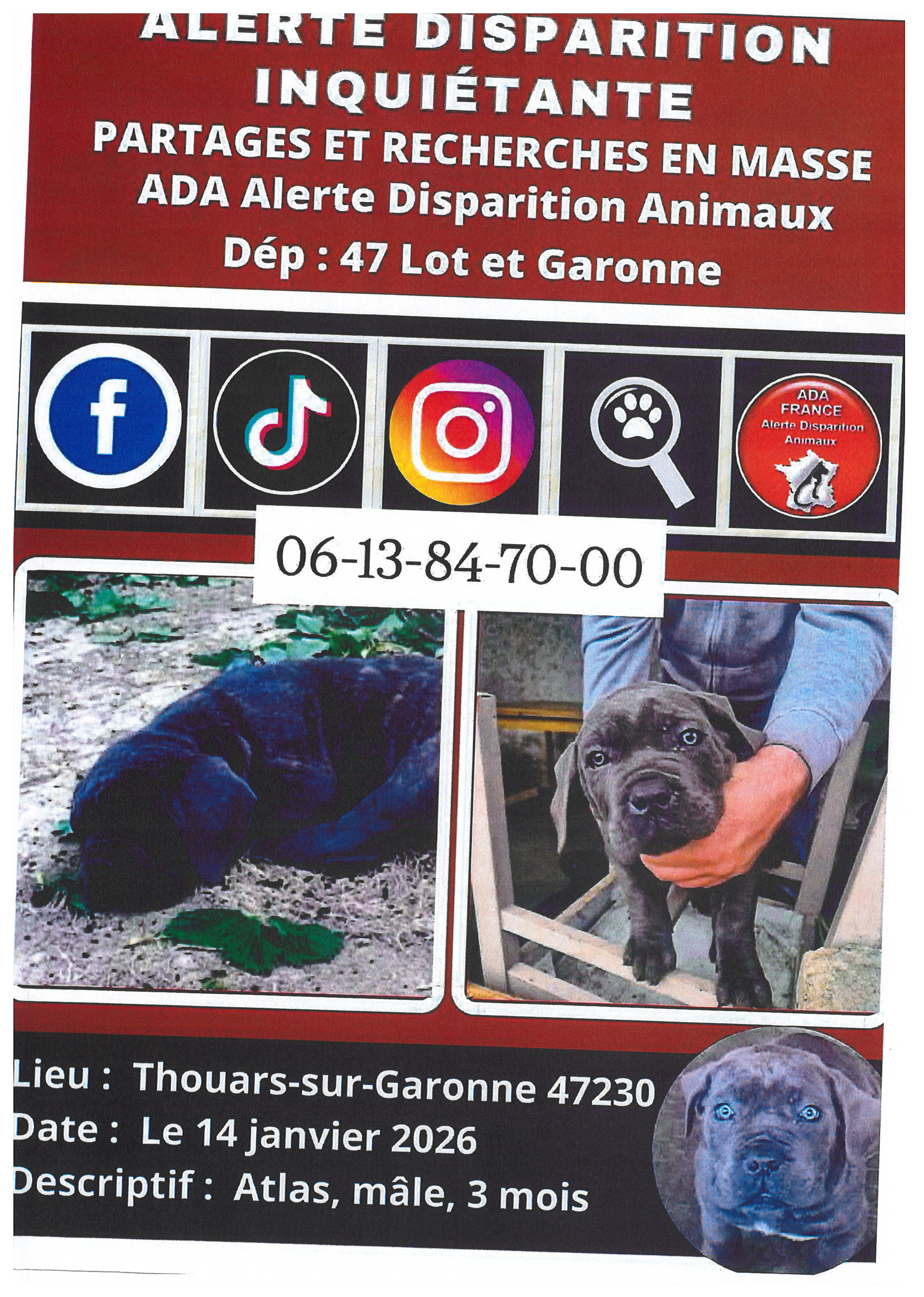 Chiot de 3 mois Cane Corso disparu à Thouars 47230 , le 14 janvier 2026 . Il répond au nom d'Atlas.